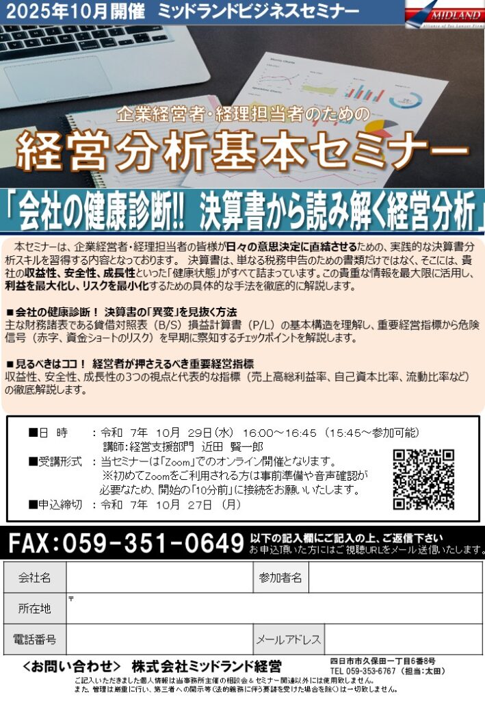 《2025年10月開催ビジネスセミナー》のご案内です! 今回のテーマは 『会社の健康診断!! 決算書から読み解く経営分析』です。 日 時:令和7年10月29日(水) 16:00~16:45 講 師:経営支援部門 近田 賢一郎 受講形式:ZOOMオンライン受講 参 加 費 :無料 申込締切:令和7年10月27日(月) 本セミナーは、企業経営者・経理担当者の皆様が日々の意思決定に直結させるための、 実践的な決算書分析スキルを習得する内容となっております。 決算書は、単なる税務申告のための書類だけではなく、そこには、貴社の収益性、安全性、 成長性といった「健康状態」がすべて詰まっています。 この貴重な情報を最大限に活用し、利益を最大化し、リスクを最小化するための具体的な手法を 徹底的に解説します。 ■会社の健康診断! 決算書の「異変」を見抜く方法 主な財務諸表である貸借対照表(B/S)損益計算書(P/L)の基本構造を理解し、 重要経営指標から危険信号(赤字、資金ショートのリスク)を早期に察知するチェックポイントを解説します。 ■見るべきはココ! 経営者が押さえるべき重要経営指標 収益性、安全性、成長性の3つの視点と代表的な指標(売上高総利益率、自己資本比率、 流動比率など)の徹底解説します。 詳しくは下記リンクをご参照ください⇩ 【無料】かつ【オンライン】ですので、ネット環境とPC・スマホがあれば、 どこからでもお気軽に参加できます!ご興味のある方は、上記URLのお知らせフォームからお申込み頂くか、 弊社担当者までご連絡ください!